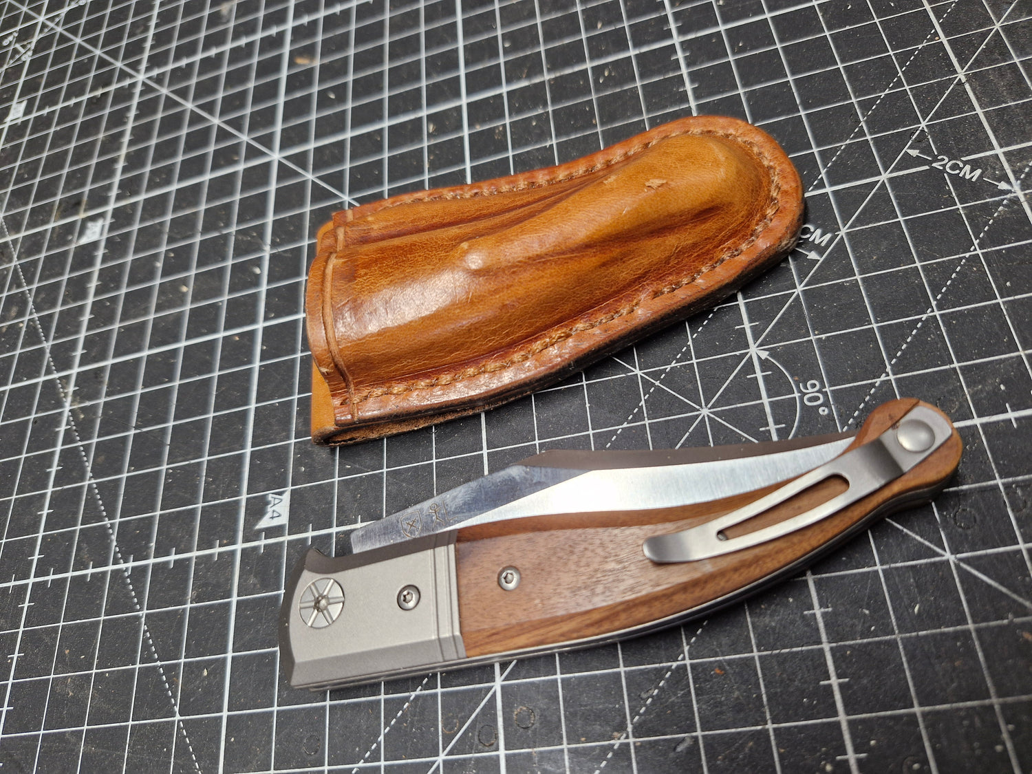 Een case op maat gevormd. Voor een heel mooi mes 'Gitano' Design Gudy van Poppel. Met riemlus. Compact design.