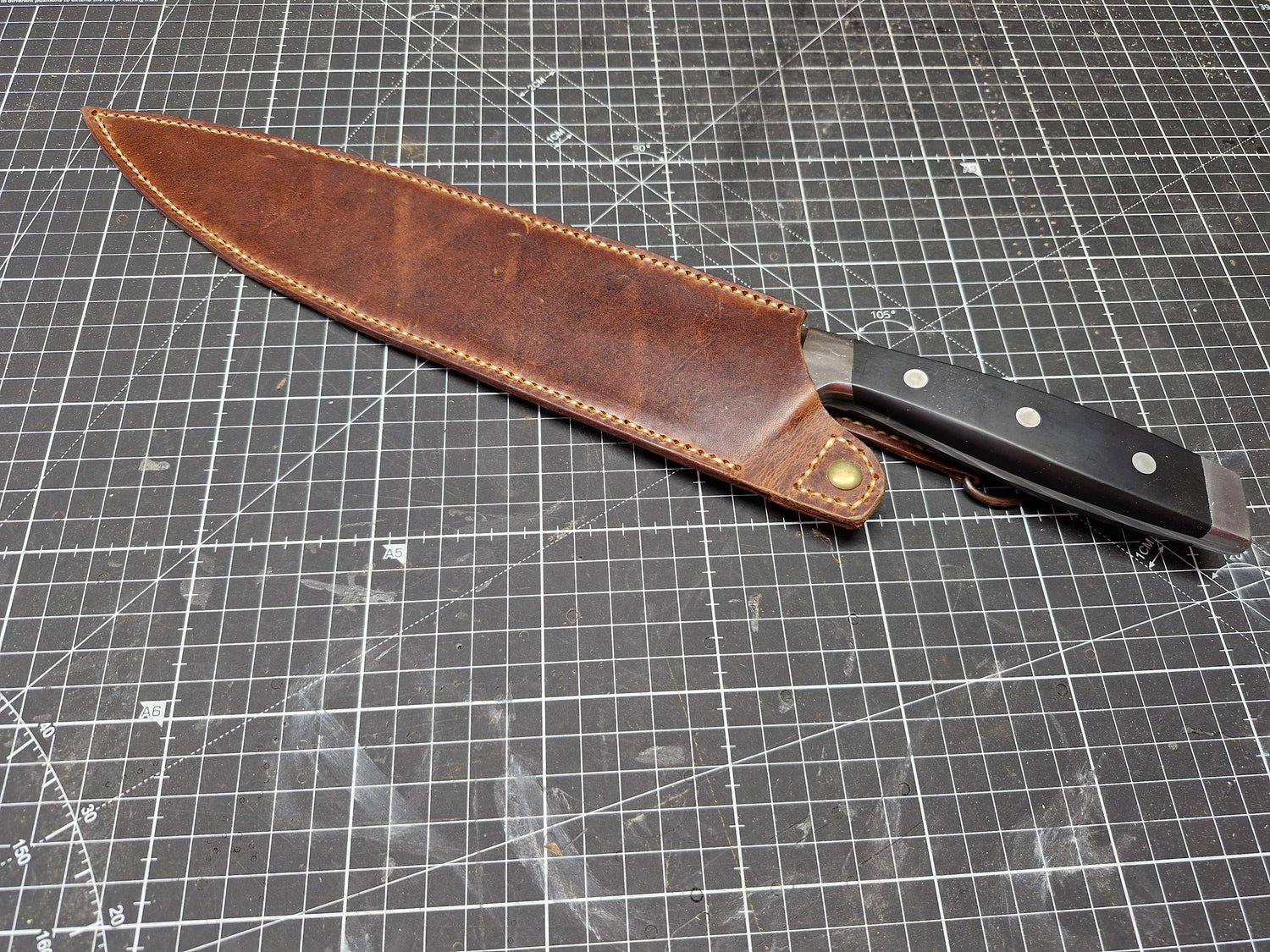 Een hoes voor een flink keukenmes (40Cm) Dit is een high-end mes. De eigenaar is er daarom ook erg zuinig op. Met deze hoes is het mes goed beschermt.