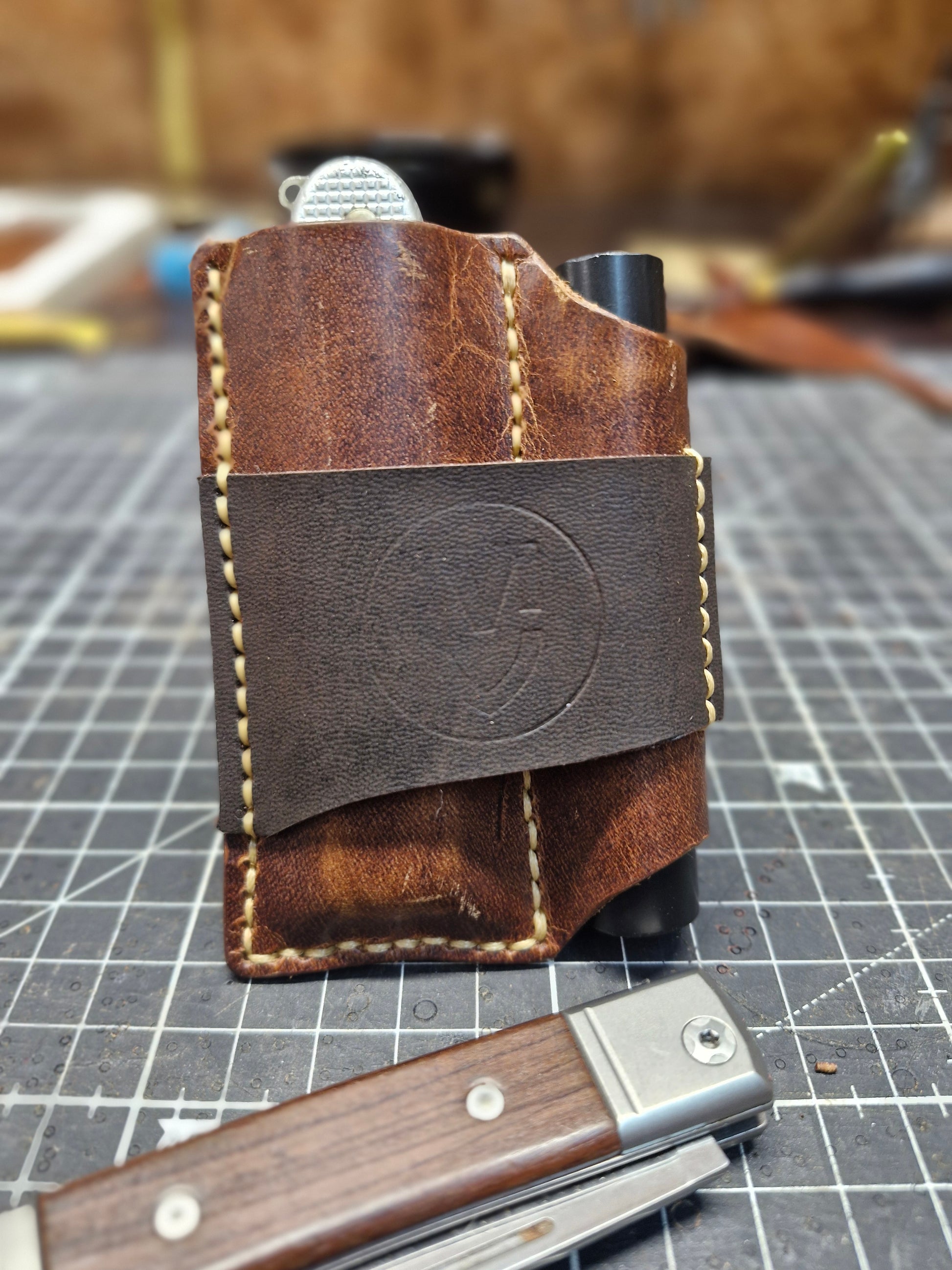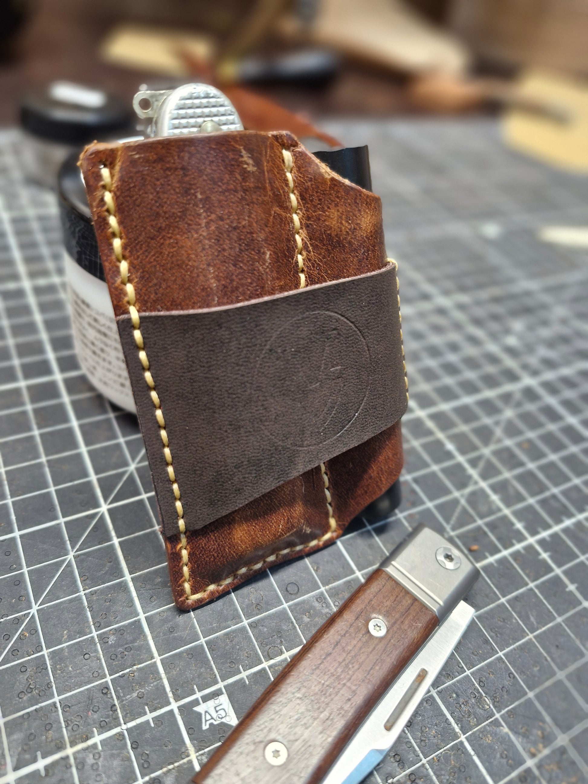 Een edc-Pouch van hoogwaardig leer. Stevig maar wel klein en makkelijk in de broekzak.